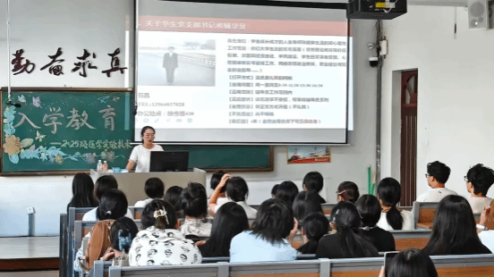 医学实验学生党支部书记陈博萱对新生进行入党启蒙教育,详细介绍了学院学籍管理规定、学生违纪违规处理办法、奖学金和助学金相关政策等。