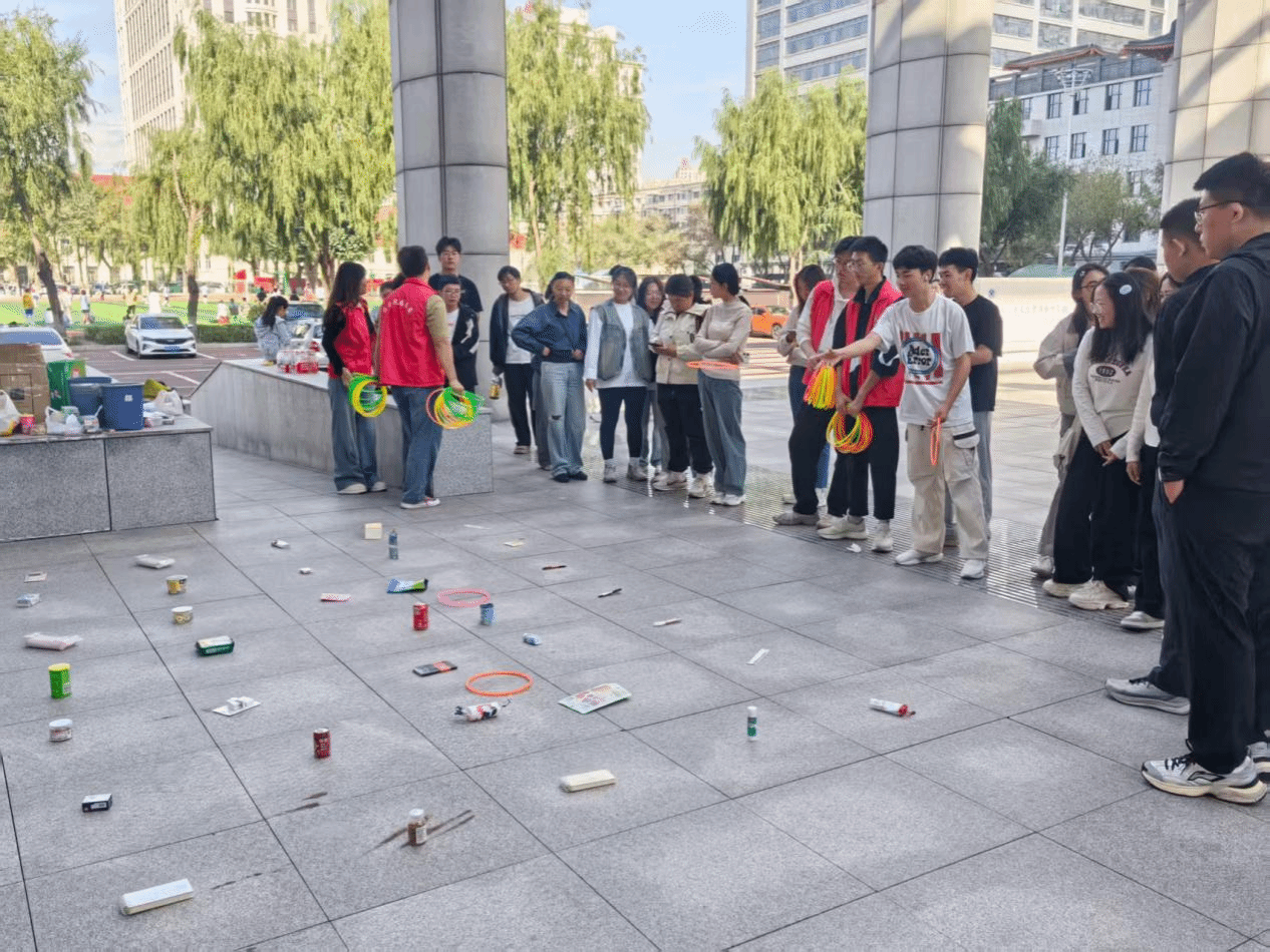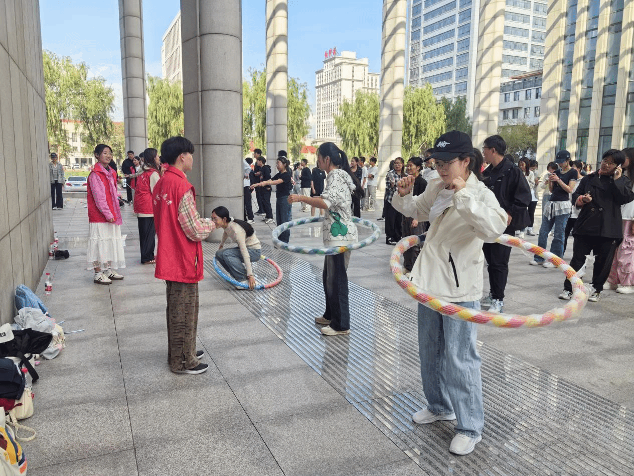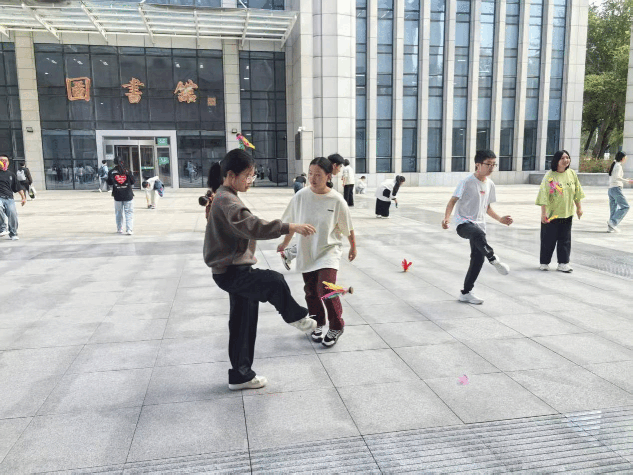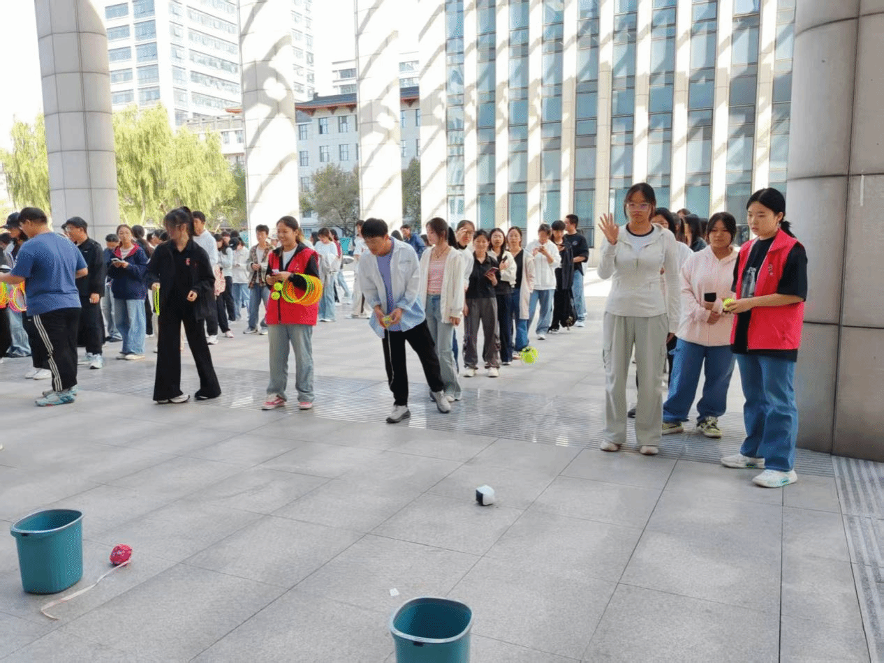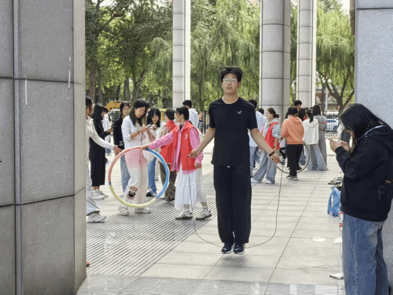 踢毽子、投沙包、跳绳、呼啦圈4个项目依次开展,现场气氛热烈。踢毽子区,彩毽脚尖翻飞;投沙包区,瞄准投掷间,雀跃与调侃尽显鲜活;跳绳区,绳响伴脚步,众人拼尽全力展不服输态度;呼啦圈区,彩环绕腰飞转,坚持与花式动作获喝彩,满是朝气。在最受期待的“套圈赢奖”环节,将现场气氛推至顶点。参加活动的同学们说:“享受过程的快乐,比奖品更珍贵。”