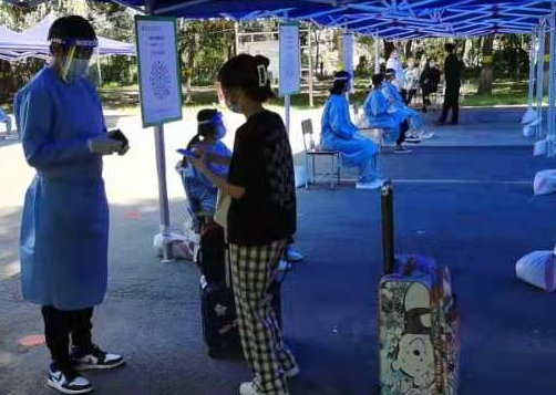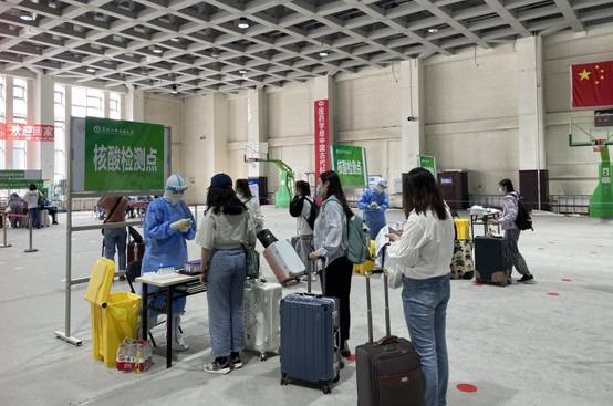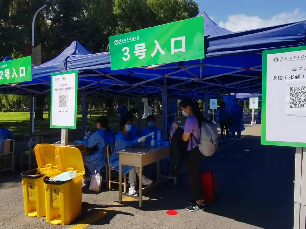 学生进入校园后进行“一测四验”,即体温检测、验证通信大数据行程卡、龙江健康码、“今日校园”返校码、48小时内核酸报告。在核酸检测后,学生领取寝室楼通行卡,在志愿者带领下返回寝室。
