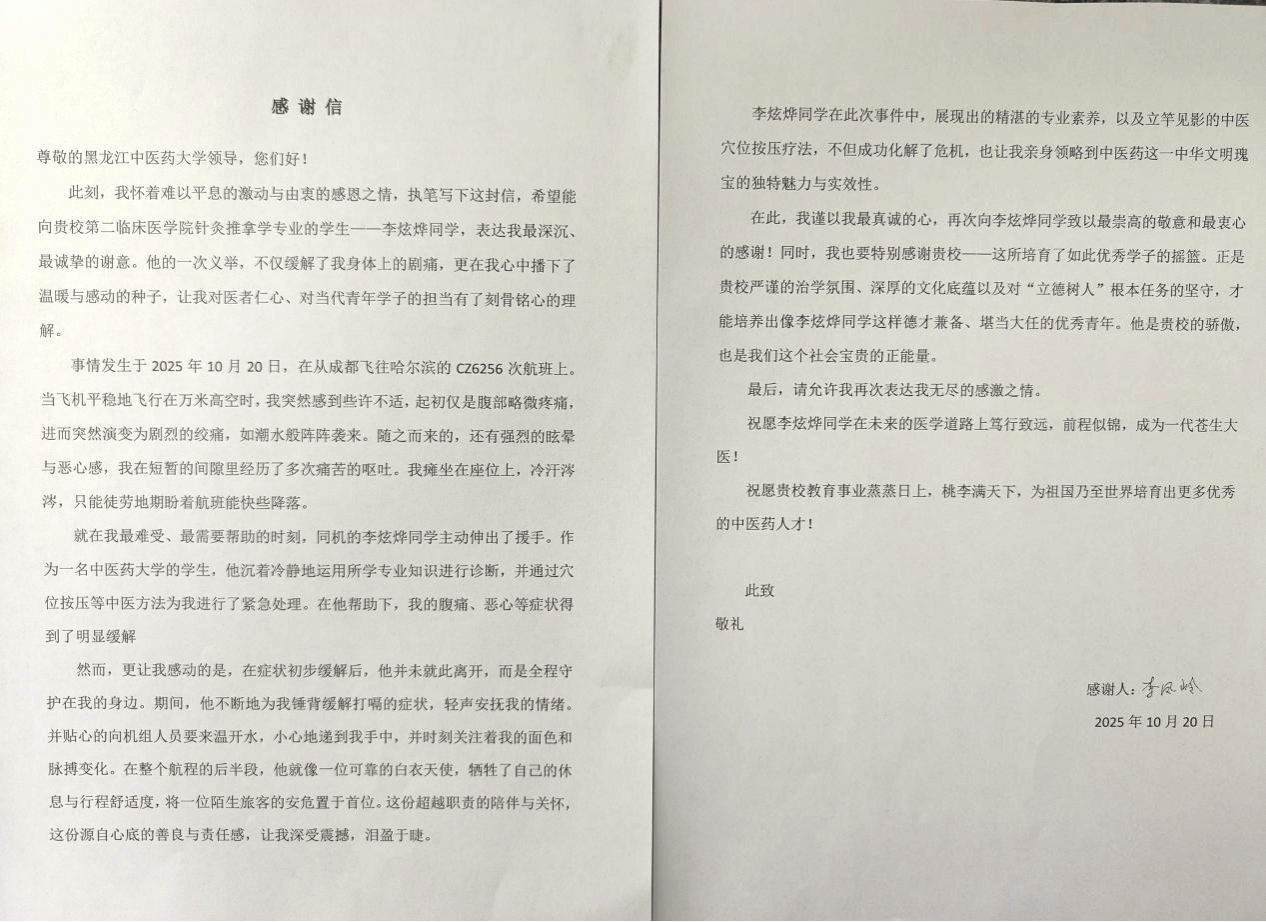 2025年10月,两名来自完美平台第二临床医学院的学生,运用所学中医知识,分别成功救助了在飞机飞行过程中突发身体不适的旅客。