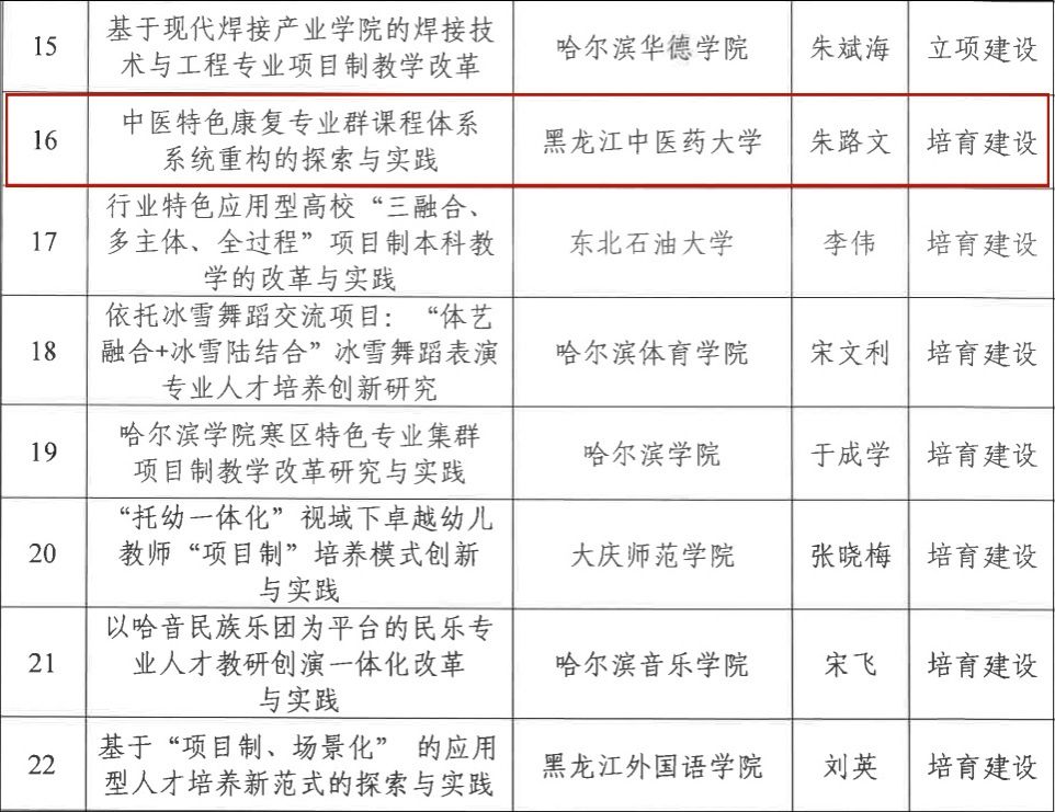 近日,省教育厅公布“黑龙江省项目制教育教学改革培育建设项目”遴选结果,完美(中国)一站式服务平台《中医特色康复专业群课程体系系统重构的探索与实践》项目名列其中。