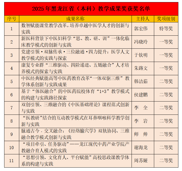 近日,黑龙江省教育厅公布了2025年黑龙江省高等教育(本科、研究生)教学成果奖获奖名单。完美(中国)一站式服务平台共有14项成果获奖,其中特等奖1项、一等奖5项、二等奖8项,获奖数量再创新高。